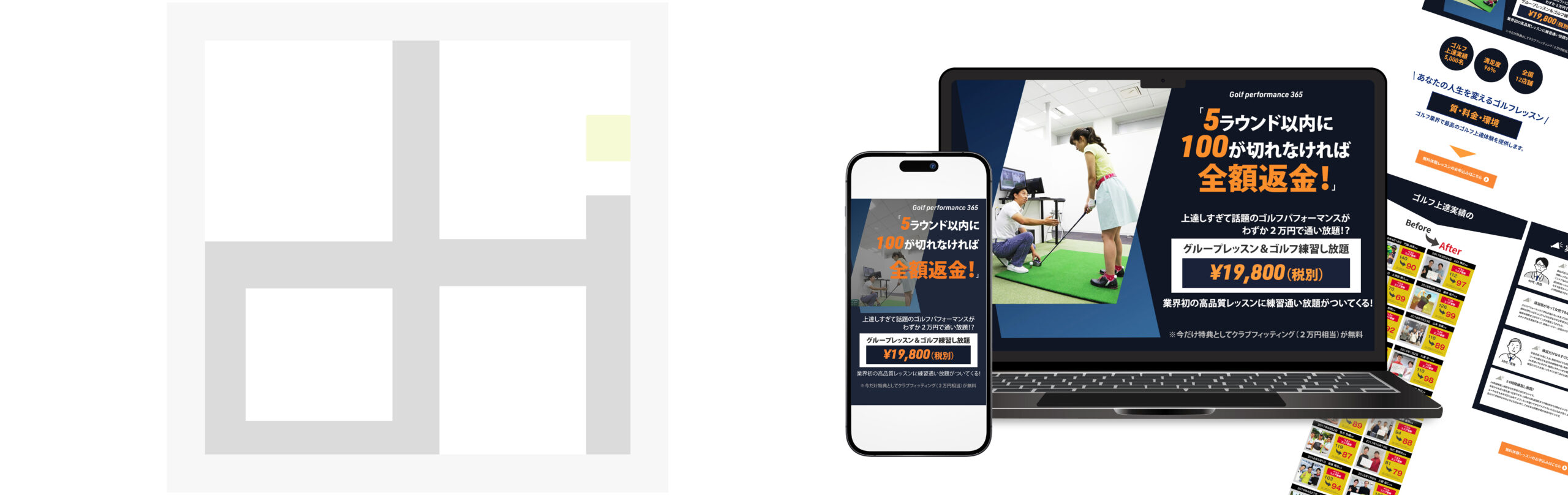 ゴルフ練習スタジオへの誘。50代~60代男性ゴルファー向け。 ゴルフ教室の中でも安い価格帯ということで、安心感… 続きを読む: 室内ゴルフ教室のLP(ヘッダー) - ゆがみ矯正インソールの広告バナー